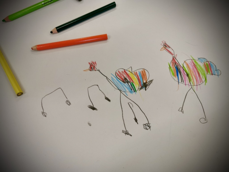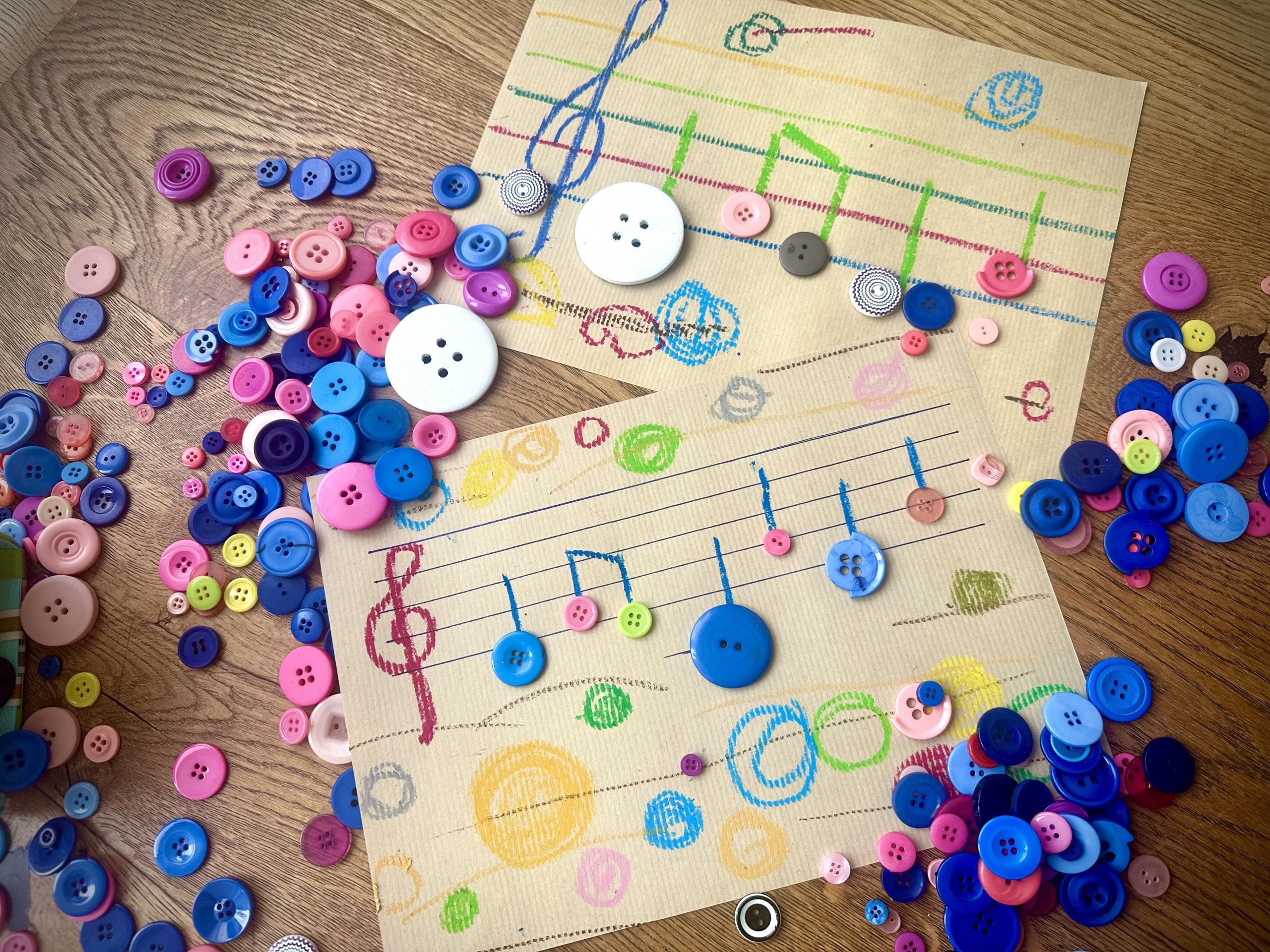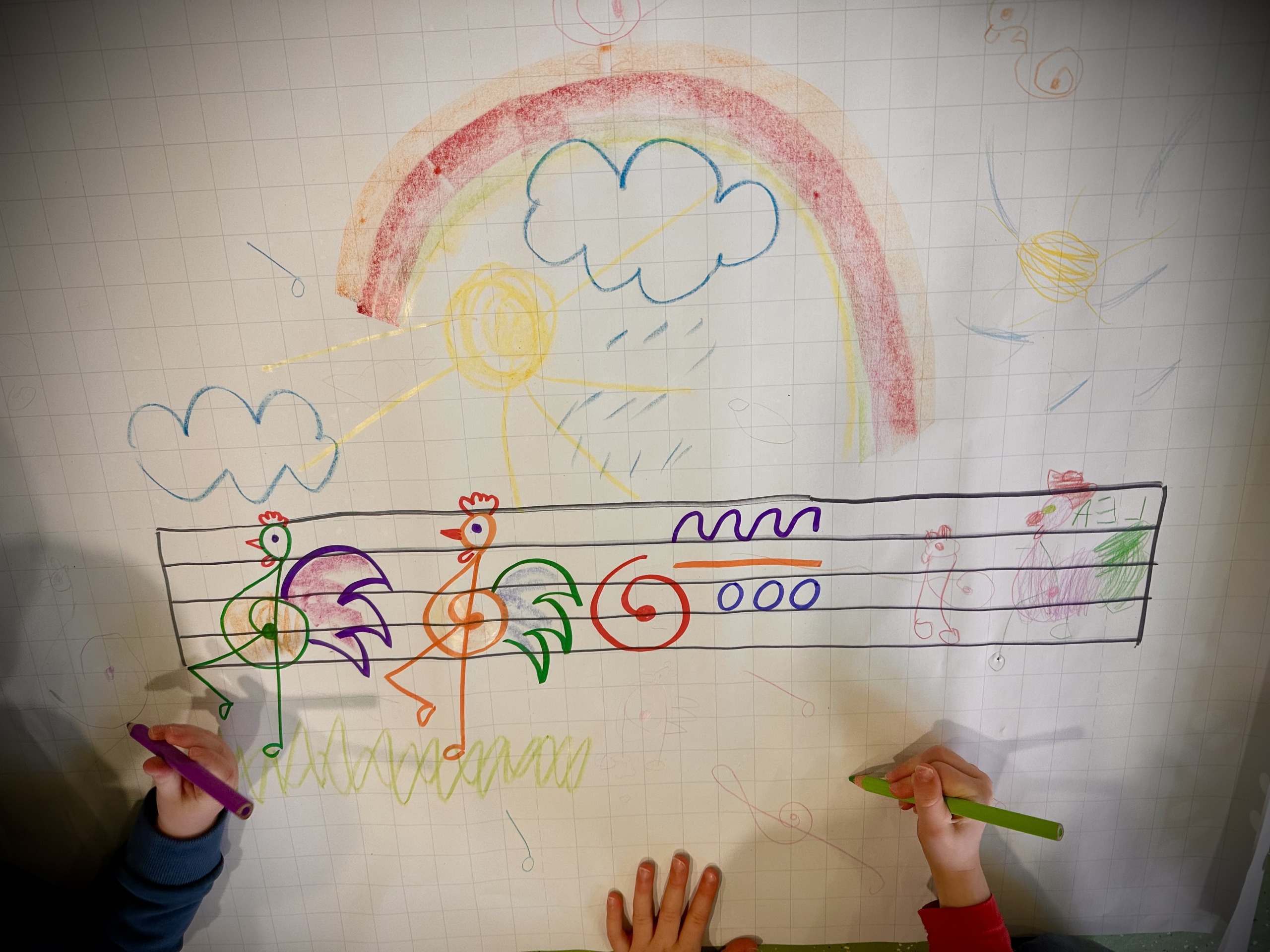Für unsere kitainternen Musikstunden sind Noten zunächst nicht primär wichtig. Wir lernen Lieder durch das Hören und Nachahmen einer Melodie. Damit sich Texte besser merken und verinnerlichen lassen, kombinieren wir Melodie und Text häufig mit verschiedenen Bewegungen und Gesten. Noten brauchen wir hierbei weder für das Nachsingen noch für eine passende gestische Begleitung.
