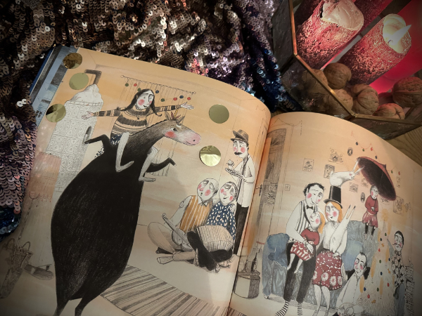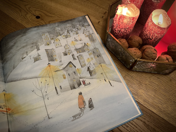Und obwohl die Menschen in der Stadt mit ihren Weihnachtsvorbereitungen beschäftigt sind, strahlen die Illustrationen Ruhe und Besinnlichkeit aus. Parallel zur Heimkehr der Zirkusleute in ihre Familien, wechselt die Farbgebung vom Blau zum Orange, vom Unterwegssein zum Ankommen.