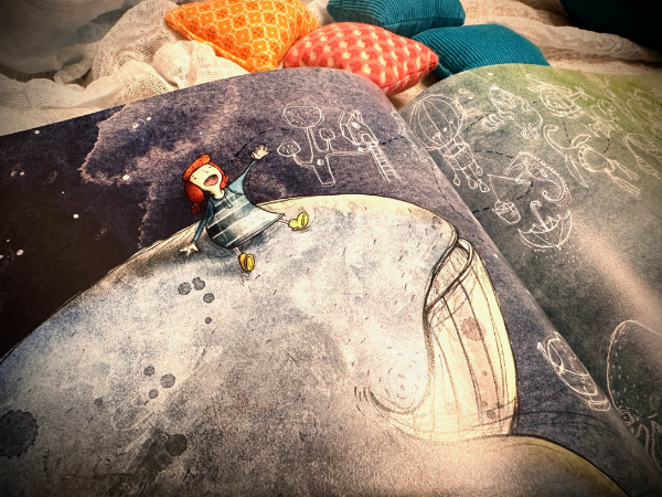 von Rebecca Gugger & Simon Röthlisberger, erschienen beim NordSüd Verlag, erzählt in zarten Worten und luftig leichten Sätzen von Gedanken und Träumen, die kommen und gehen, ungefähr so, wie eine Seifenblase, die auf Deiner Hand landet oder wie ein großer, fliegender Wal, der nachts vor Deinem Fenster auftaucht.