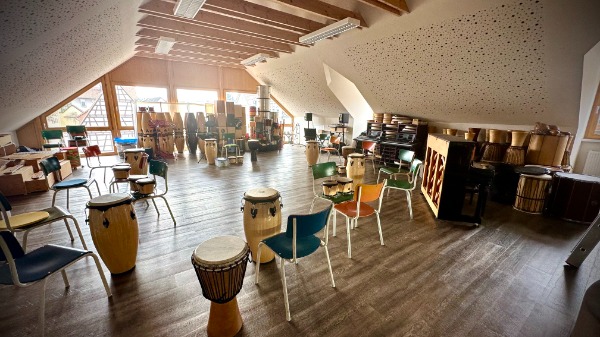 Vom Keller bis zum Dach grooved die Akademie: mit Snare- und Bass-Drums, Floor-Tom und Tom-Toms, HiHat und Becken im Keller kann Stickhaltung und Spielposition am Schlagzeug erlebt und dynamisch umgesetzt werden.