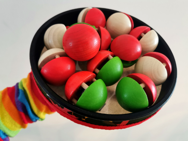 Zur rhythmischen Begleitung eignet sich vermutlich nichts besser, als unsere Kugel-Glöckchen in Rot und Grün oder Rot und Natur. (Diese sind zum Beispiel beim Institut für elementare Musikerziehung zu haben). Ein Glöckchen vor die Nase gehalten zaubert im Nu ein Clownsgesicht aus uns.